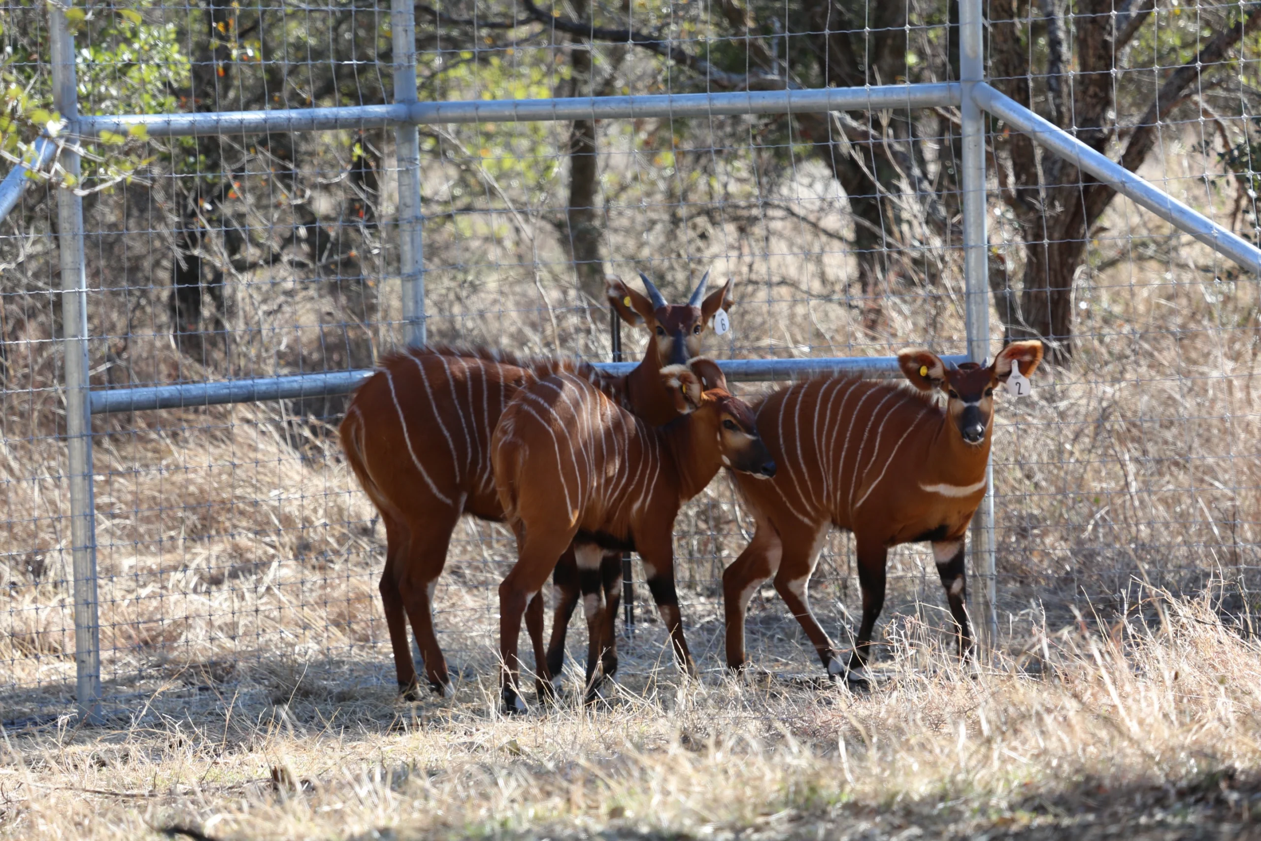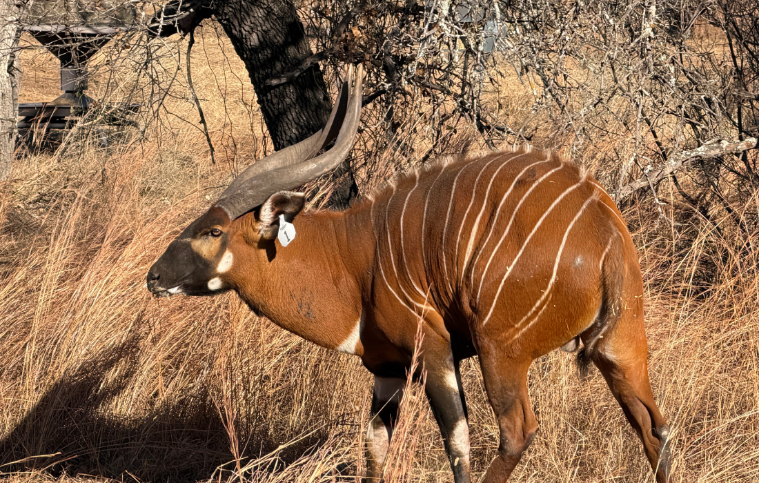 Bongo are one of the largest African forest Antelope species. They have a reddish-brown (chestnut) coat, black and white markings, white-yellow stripes and long slightly spiraled horns. The stripes help to camouflage the species. Coats of the Male Bongo get darker with age. There are 10-15 vertical stripes that spread along the back from the base of the neck to the rump. The number of stripes is rarely the same on both sides. It also has a short, bristly, brown ridge of dorsal hair from the shoulder to the rump. The white stripes run into the ridge. Bongos have 2 heavy, slightly spiraled horns that slope over their backs. Bongos are found in the tropical jungles with dense undergrowth.